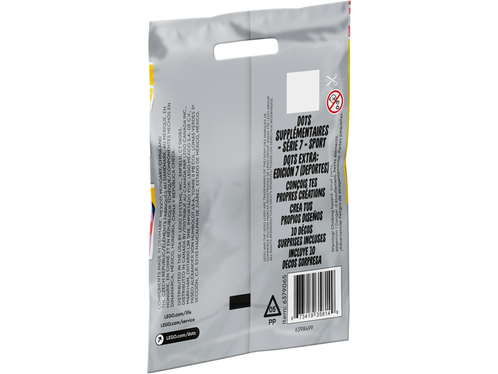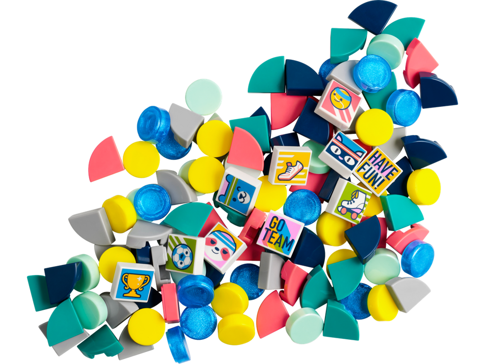 LEGO Extra DOTS Serie 7 - SPORT. Il sacchetto contiene 115 pezzi LEGO DOTS, inclusi pezzi dai colori vivaci, diversi elementi blu trasparente e 10 tessere con decorazioni casuali da collezione (16 in totale).